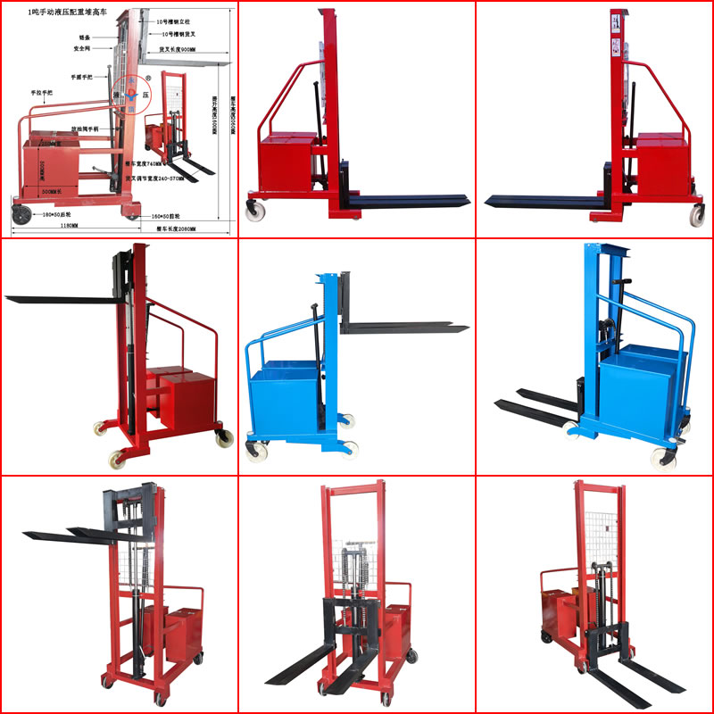 1吨配重式手动液压升高车 1.6米无腿式堆高车 平衡配重型装卸叉车